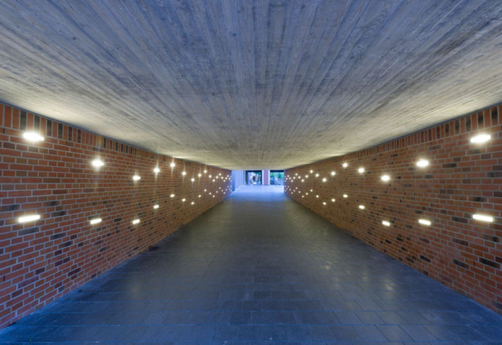 In dem Tunnel, der unter der Straße hindurch die Anbindung zum Fachmarkt schafft, bilden rund 100 LED-Wandeinbauleuchten eine spielerische Thematisierung des angrenzenden Binnengewässers Serrahn.